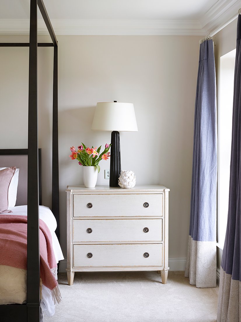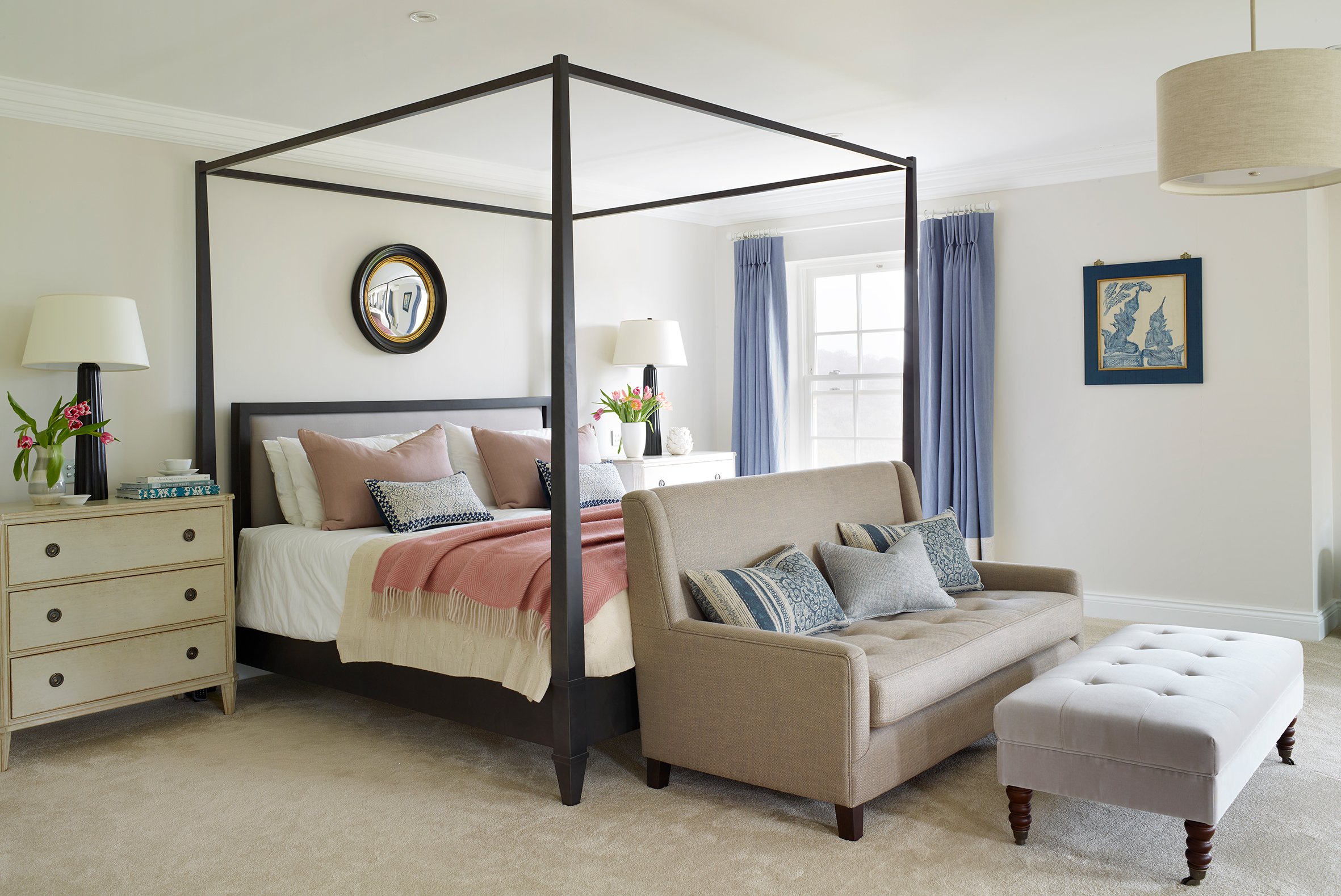 In the spacious master bedroom, Kelly from Sims Hilditch has contrasted the clean lines of a bespoke modern, four poster bed with classic Gustavian Chelsea Textiles bureau side tables to suggest the scheme has come together organically over time. I added the soft pink Neptune herringbone throw to the bed to tie in with the dusky pink cushions and enhance this subtle colour palette. I dressed the bedside tables with vases of pretty pink tulips, books and ornaments to make the room photo shoot ready.