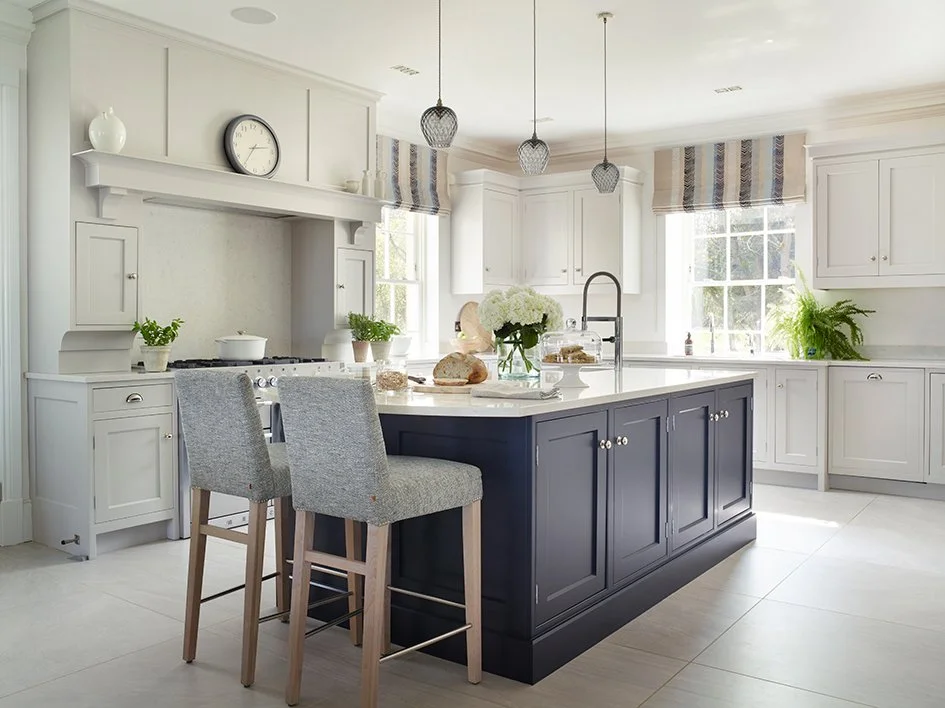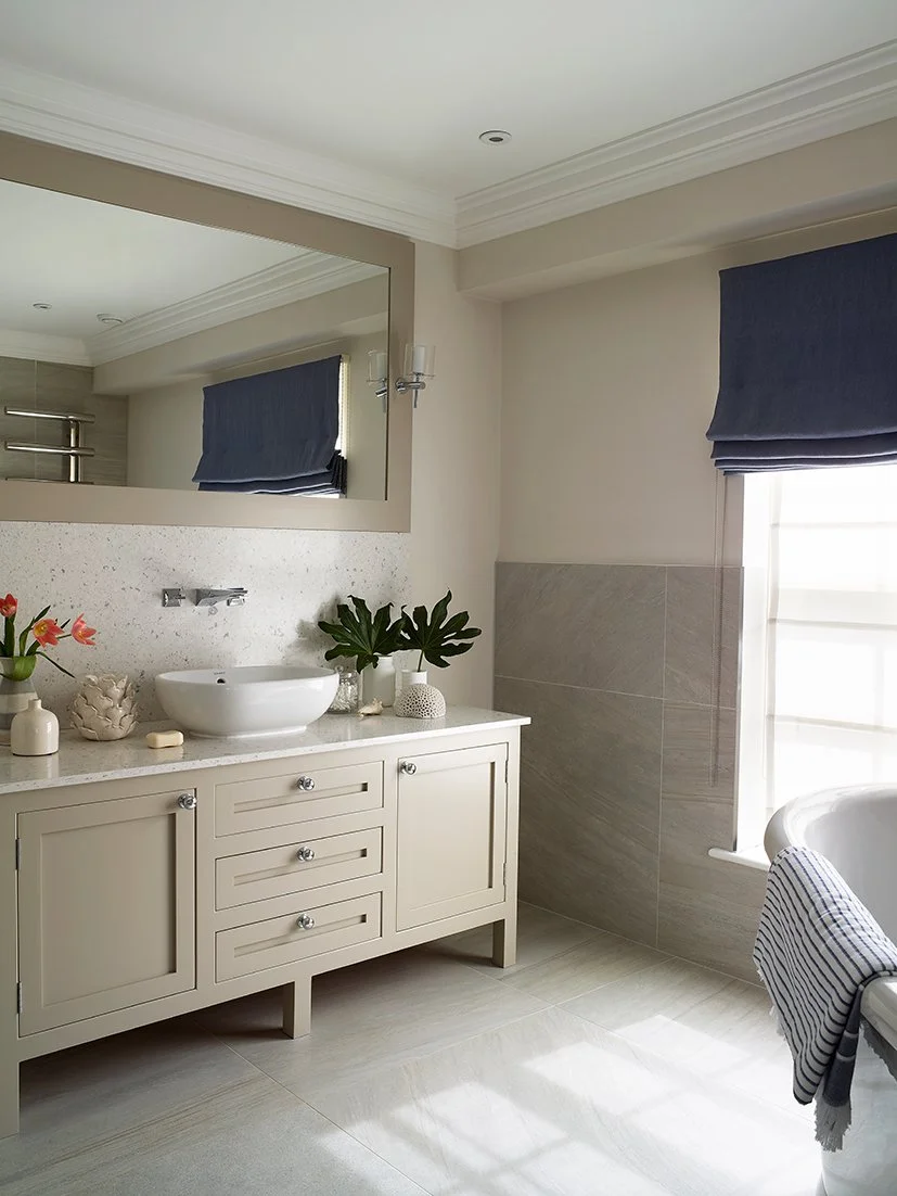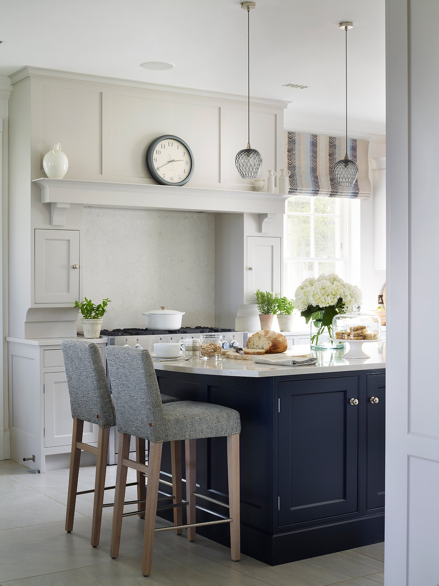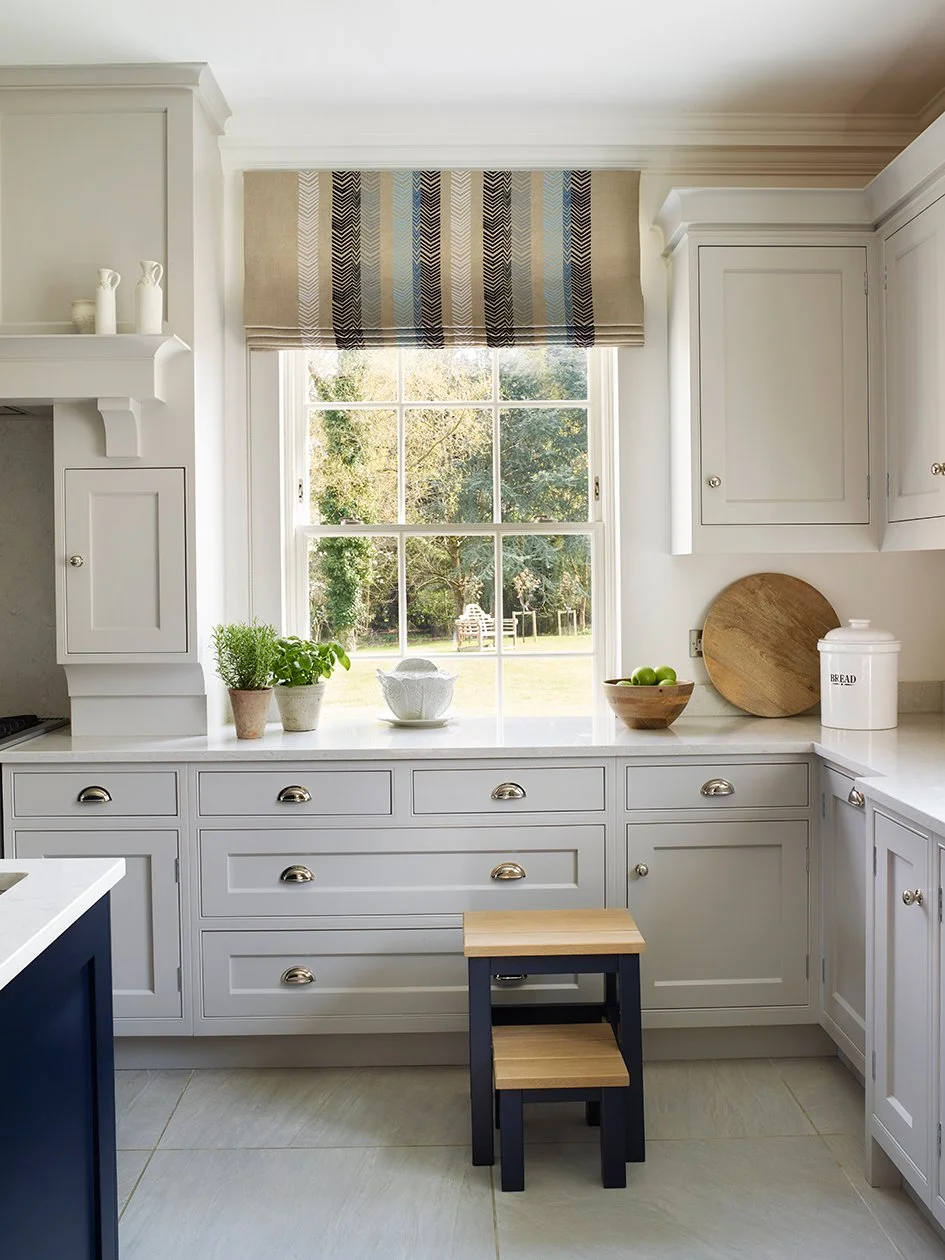 Ginni’s classic country style kitchen is a light space with dual aspect views on to the sprawling gardens. I added splashes of green with herbs in terracotta pots, a fern, apples, and Neptune ‘Castleford’ glass vase of white hydrangeas to soften hard edges and link the outdoors. Bread on a chopping board, muesli in a glass Neptune ‘Wingfield’ jar, a Neptune ‘Bowsley’ cake stand and ‘Broadfield’ glass dome create a homely, welcoming feel. The wooden chopping board, bowl and stepping stool tie in with the warm oatmeal tones in the striped ‘Book End Navy’ Christopher Farr blinds.