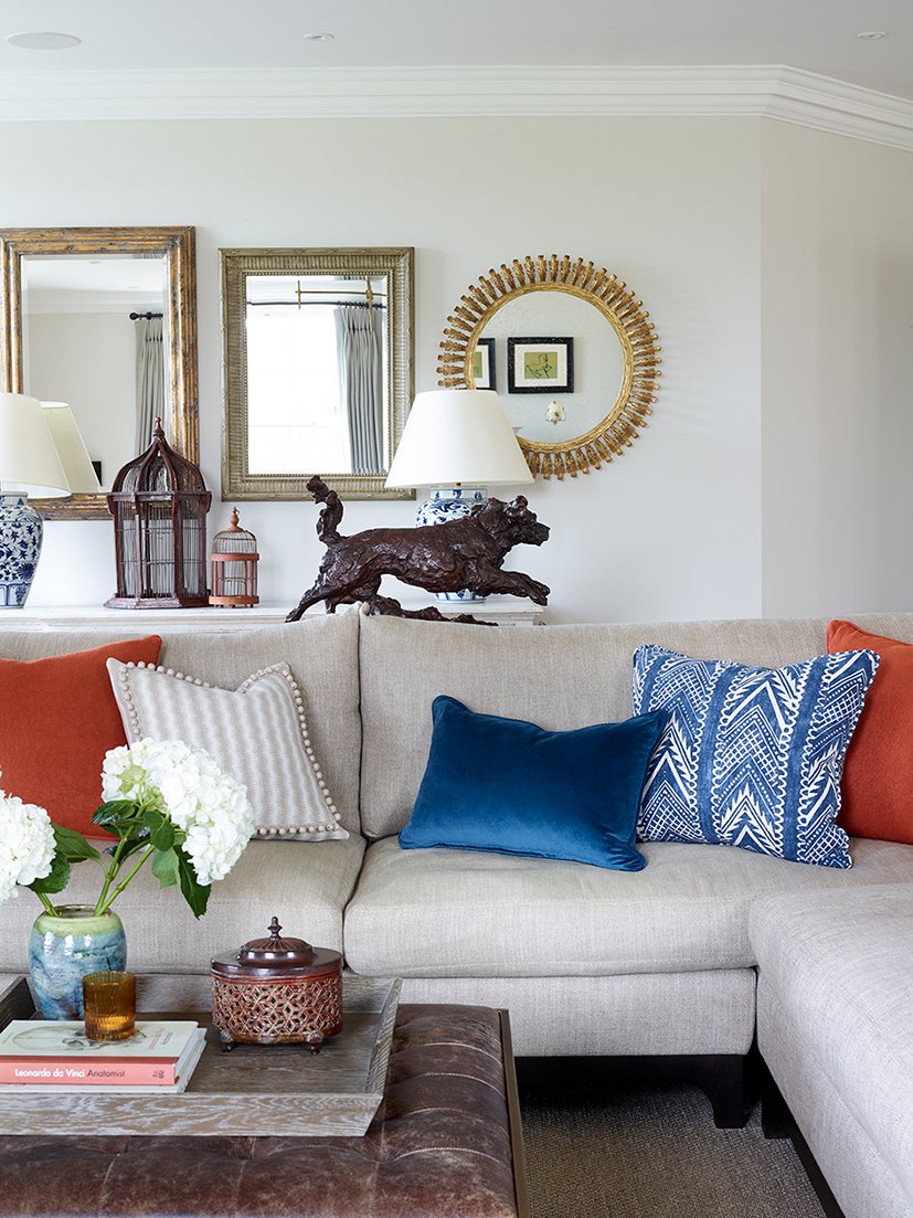 Ginni had sold most of her furniture from her previous house as she felt her style had evolved and wanted a fresh start so designer, Kelly Ross layered the rooms with antiques and new pieces to give the interiors character. The elegant drawing room scheme incorporates bespoke pieces, including the walnut bookcase that, at first glance, looks like an antique. I love the mix of mustard and indigo patterned cushions that tie in with the antique rug. I sourced some extra Isla Finch gold velvet cushions from Neptune to emphasise this uplifting colour palette when we photographed the house. I introduced all the props on the Robert Langford coffee table, including the coffee table books and the arrangement of coral Snapdragons, which work well with the mustard. A tray with a coffee pot and crockery creates a welcoming feel, as if someone has just stepped out of the room. Before photographing a space, I do a lot of rearranging and refining, until the balance feels just right. I might also move things from one room to another, as well as edit and remove things that I don’t think are needed. We often end up moving furniture too, depending on where we decide is the best angle of the room.