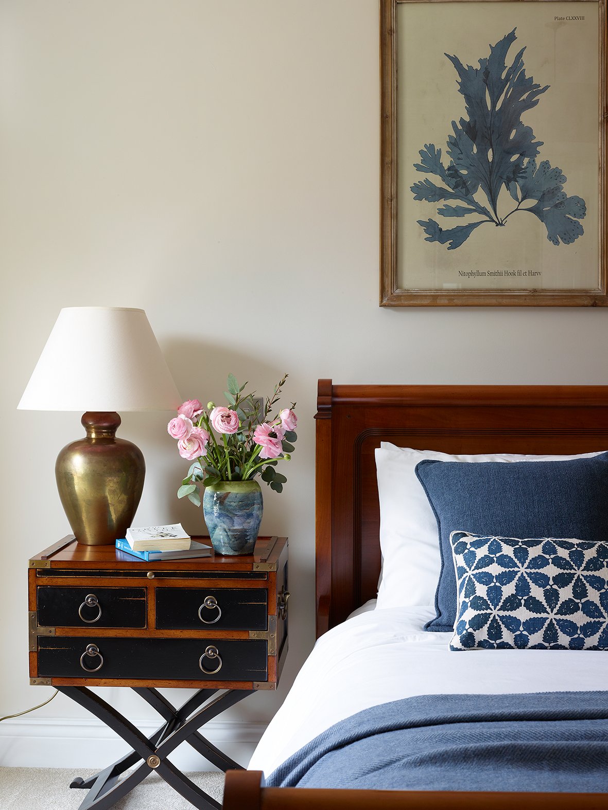 I moved the Rapture & Wright ‘Maroc’ geometric cushions from another part of the house and teamed them with this Indigo Melange throw from So Cosy to echo the grey blue tones in the OKA seaweed framed prints above the bed. I styled the bedside tables and added my own pottery vase with pale pink ranunculus to contrast with the blue hues in this guest bedroom.